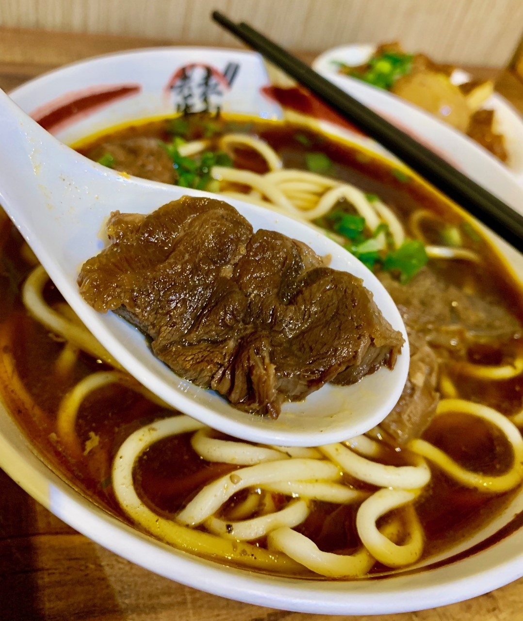 牛肉麵上點綴的青蔥,讓整碗麵看起來就很好吃。