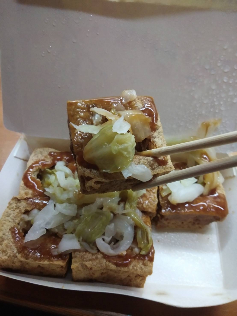 已經忘記是甚麼時候深愛上這道讓人欲罷不能的佳餚了,只記得在我長大以後,童稚天真的弟弟也想初嘗這道美食,但是一直無法跨越心中的那道防線,最後在我和媽媽半哄騙兼半引誘下,吃下一小口後,就像開啟嶄新的味蕾一樣,三大塊臭豆腐瞬間一掃而空,真的是讓我們哭笑不得。