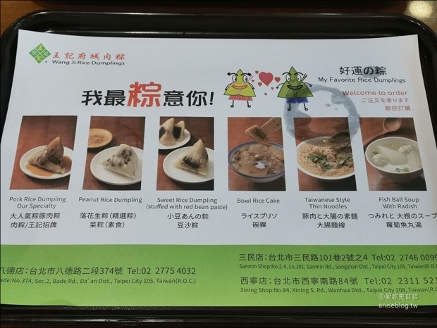 王記府城肉粽創立1992年,專門經營台南府城肉粽的販售,讓身在北部的客人也能吃到南部粽的美味。現在在各個地方都有連鎖的分店,今天來介紹的這家是位於台北市八的路上的王記府城。這家店已經做到看起來很國際化,怎麼說呢?他的菜單有日文還有英文啊!!雖然販售的品項不多但只要一想要吃粽子王記府城一定是我的首選。