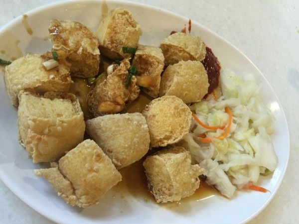很有一種小時候會來 叫賣的 臭豆腐車 賣的臭豆腐~~~ 啊 !! 是股懷念的滋味啊! 以前叫做大樹下小吃店,是深坑赫赫有名的老店之一 深坑大樹下光是這道酥炸臭豆腐真是皮酥肉嫩 切成剛好的入口大小,搭配醬油、豆瓣醬與台式泡菜