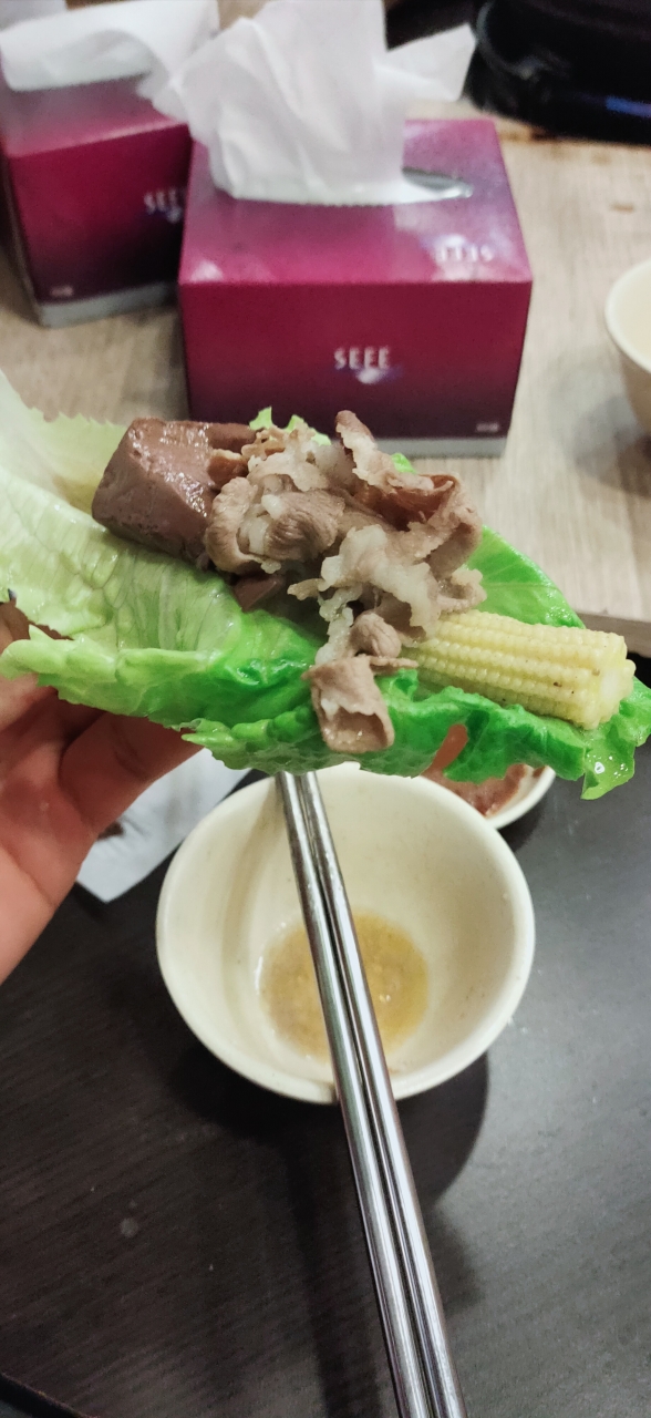 用大陸妹來夾肉片,冰冰脆脆的菜配上軟嫩的肉和鴨血非常對味。