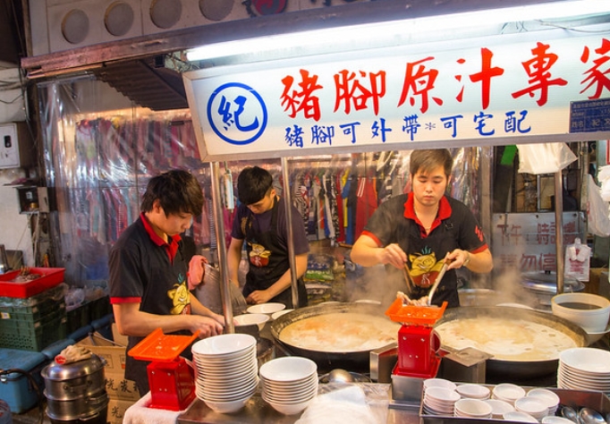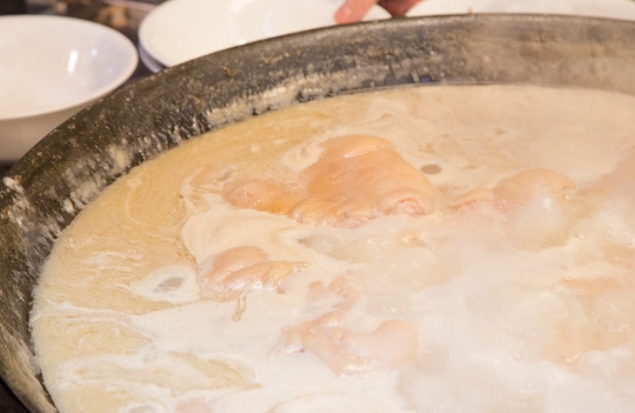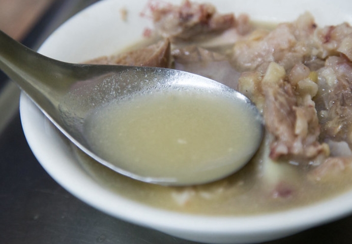有別一般用滷醬去滷的豬腳那樣有醬油的顏色,這邊的豬腳是用大鍋去燉煮的乳白色,湯頭非常的醇香,就像是日本豚骨拉麵的那種湯頭,這家排隊美食就叫做紀家豬腳原汁專家。 店內賣的東西不多,簡單來講老店為甚麼能做得久,首要就是專精,六十年來就賣豬腳湯與雞佛腳筋湯,過去的計價大多是以秤重計價,卻因為價錢問題有了不少的糾紛,現在都採固定價格,雞佛腳筋湯是兩百元