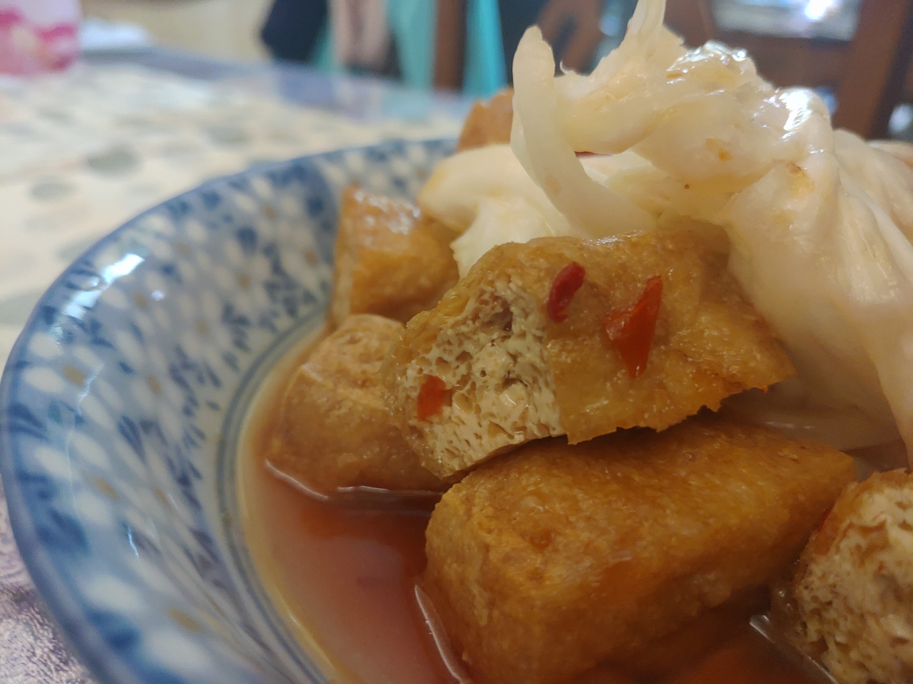 表面閃爍金光的臭豆腐,像是黃金般吸引我的目光。起初我不忍心破壞這件藝術品,但在老闆的催促下,我趕緊趁熱咬下一口。豆皮裂開的剎那,滿溢的香氣與被豆皮鎖住的湯汁噴發而出,豆皮原先的油燥被湯汁所浸潤,卻保有原先的酥脆感,而內層豆腐紮實不鬆散,沾和著獨門醬汁的鹹甜與泡菜清脆的酸辣,對味蕾帶來的刺激堪稱一絕。當了多年的饕客,臭豆腐的口感依然不變且風格獨特。